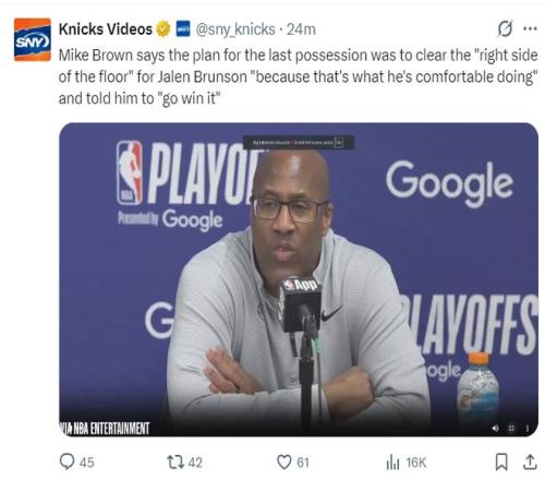 尼克斯主帥邁克-布朗更是透露:球隊(duì)絕殺的戰(zhàn)術(shù)就是為杰倫-布倫森畫的,因?yàn)椴紓惿矚g從右側(cè)去進(jìn)攻,我們就為他量身定制了這個(gè)戰(zhàn)術(shù),而且我告訴他努力去得分吧。(看起來布倫森成為最大罪人)