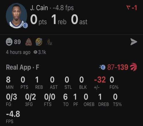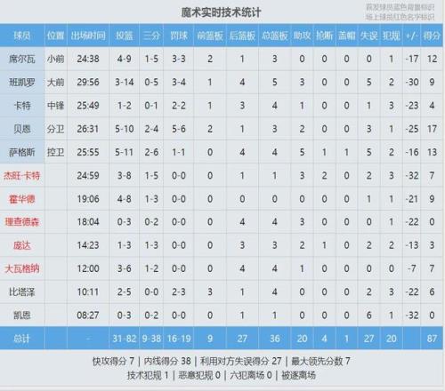 魔術(shù)上半場出現(xiàn)18次失誤,全場27次失誤創(chuàng)球隊賽季新高,此前紀錄是24次。魔術(shù)狀元班凱羅出戰(zhàn)30分鐘,投籃14中3,三分5中0,罰球4中3,拿到9分5板3助5失誤,正負值-30。替補球員凱恩出戰(zhàn)8分27秒,3中0拿到0分6失誤,正負值-32!