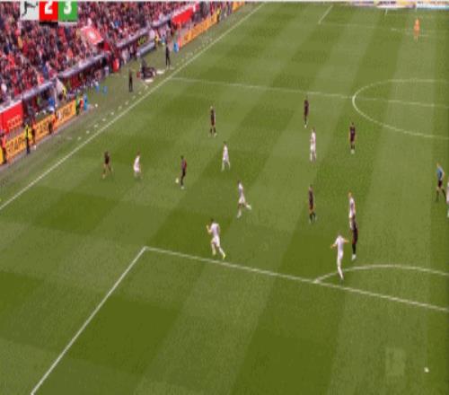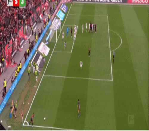 第73分鐘,易卜拉欣-馬扎推射得分,勒沃庫森5-3沃爾夫斯堡