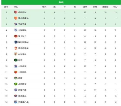 北京時間4月12日,中超聯(lián)賽第五輪結(jié)束爭奪,成都蓉城客場2比1逆轉(zhuǎn)絕殺北京國安,繼續(xù)領(lǐng)跑。云南玉昆客場4比3擊敗深圳新鵬城,排名第三位。重慶銅梁龍2比1擊敗武漢三鎮(zhèn),排名第二。本輪之后,成都、重慶和云南保持強勢,泰山隊拿到3分,排名升至第8,申花擊敗海港,積分清零,為1分。