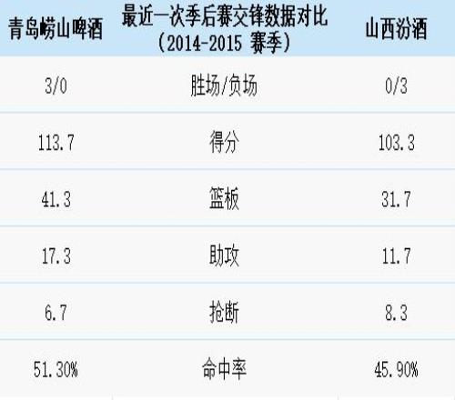 季后賽史上,兩隊僅在2014-2015賽季交過手,青島嶗山啤酒3勝0負。