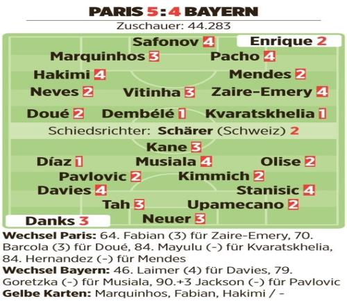 體育播報(bào)4月29日宣 巴黎在本輪歐冠主場(chǎng)5-4擊敗拜仁,《圖片報(bào)》按照慣例為兩隊(duì)進(jìn)行了賽后評(píng)分。