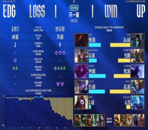 中期先鋒團,Jwei璐璐先被sasi掘墓小僵尸撓掉,隨后climber潘森被Xiaohao趙信終結(jié),Zdz賽恩再留住Hena送Leave蕓阿娜人頭,EDG打出1換2。再到小龍團,xiaohao趙信捅進人群被殺,Leave蕓阿娜被UP三人傷害灌死,UP打出1換2。